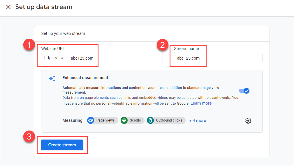 You'll then enter your website URL and stream name. Leave all other settings as is, and click "Create stream", as shown below.