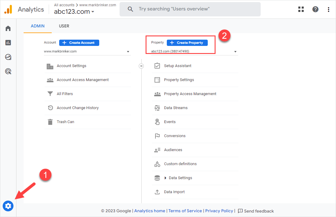 If you already have a Universal Analytics account, log into your dashboard at analytics.google.com. Click on the gear icon in the lower left, then click the blue "Create Property" button to manually create your GA4 property, as shown below.
